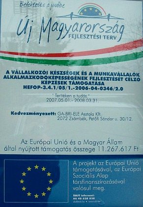 Úniós pályázatot nyert egy zsámbéki étterem A zsámbéki székhelyű Gabriele Asztala Kft. többéves előkészítő munka után, együttműkdve egy pályázatíró céggel több, mint 11 millió forint értékben nyert képzési és oktatási támogatást az Európai Únió HEFOP (Humán Erőforrás Operatív Program) 3.4.1/05/1. számú pályázatán. A megnyert pályázat keretében a Mind Center Kft. heti rendszerességgel kihelyezett angol és német nyelvoktatást, tovább - szintén kihelyezett jelleggel - hetente-kéthetente félnapos vezetői és menedzsertréniget tart a zsámbéki cég dolgozóinak. Mészáros Sándorné, a cég ügyvezetője elmondta, hogy az oktatáson egy alkalommal dolgozóik fele - közöttük ő maga is - vesz részt. A pályázat önrész nélküli, utófinanszírozás jellegű, vagyis az Európai Únió a felmerült és igazolt költségeket utólag téríti meg. |