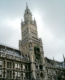 München, a városház tornya a Marienplatz felől és a toronyban lévő harangjáték közelről.
